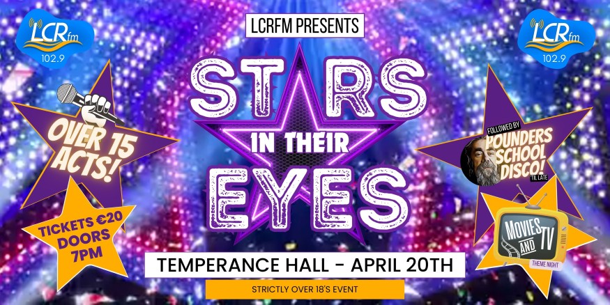 Get ready for a dazzling night of talent and entertainment as LCRfm proudly announces the return of "Stars in Their Eyes" on April 20th. This year's theme is set to captivate audiences with the magic of Movies & TV. The stage will come alive with impersonations of beloved characters and iconic performances. Don't miss your chance to be part of the excitement – tickets are on sale now, and to enhance your experience, reserved seating options have been added. Secure your spot for an unforgettable evening of music, glamour, and star-studded fun! See LCRFM.ie to book your tickets!